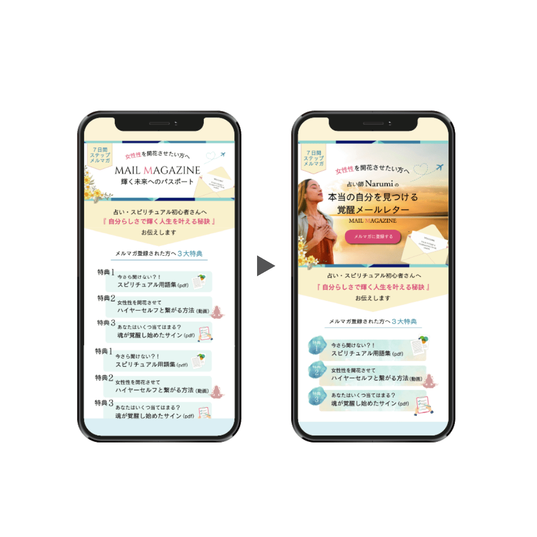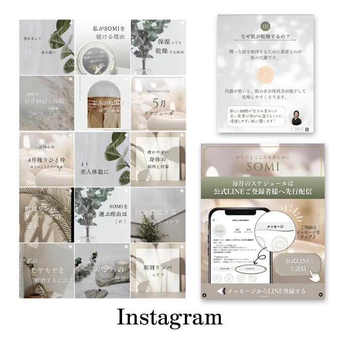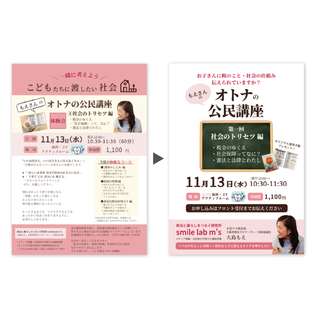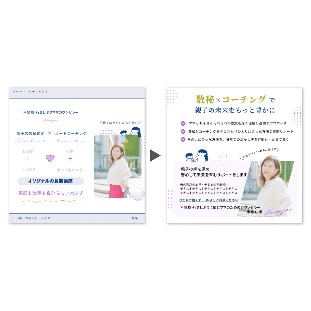 インスタ、チラシ、リッチメニュー、Webサイトなど、さまざまな媒体のビフォーアフターを繰り返し学ぶことで、効果の出る表現や、デザインのコツ、操作方法まで、丸ごと最速で身に付きます。