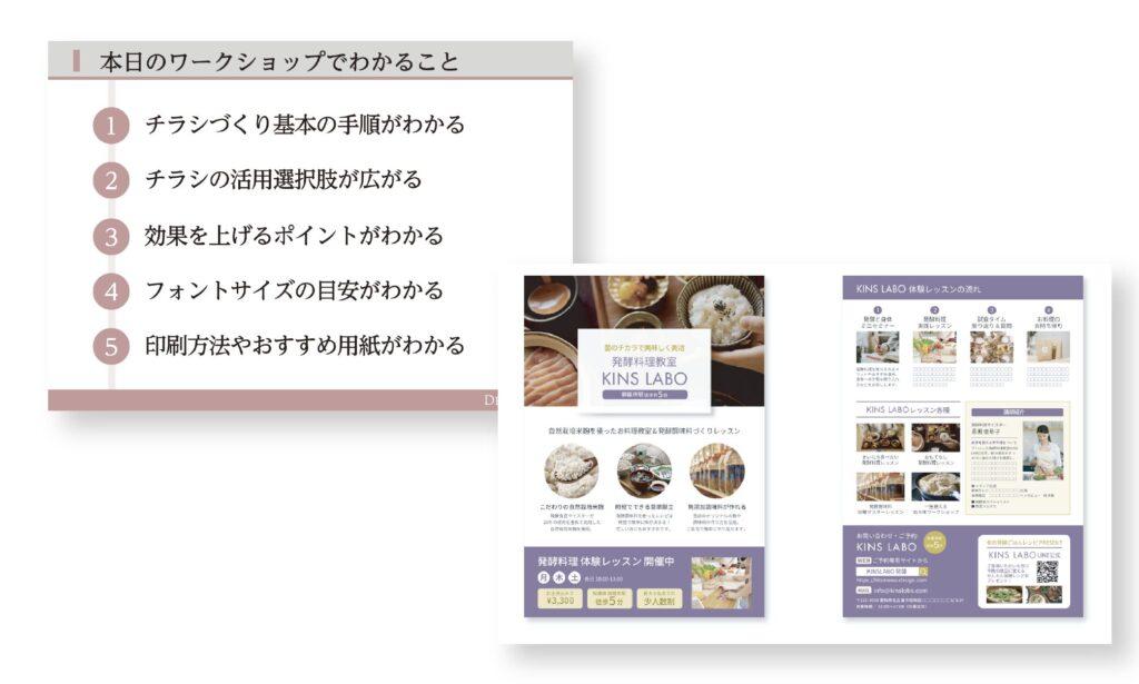 チラシの種類、制作ステップ、Canvaでの設定や余白バランスなどを学びます。